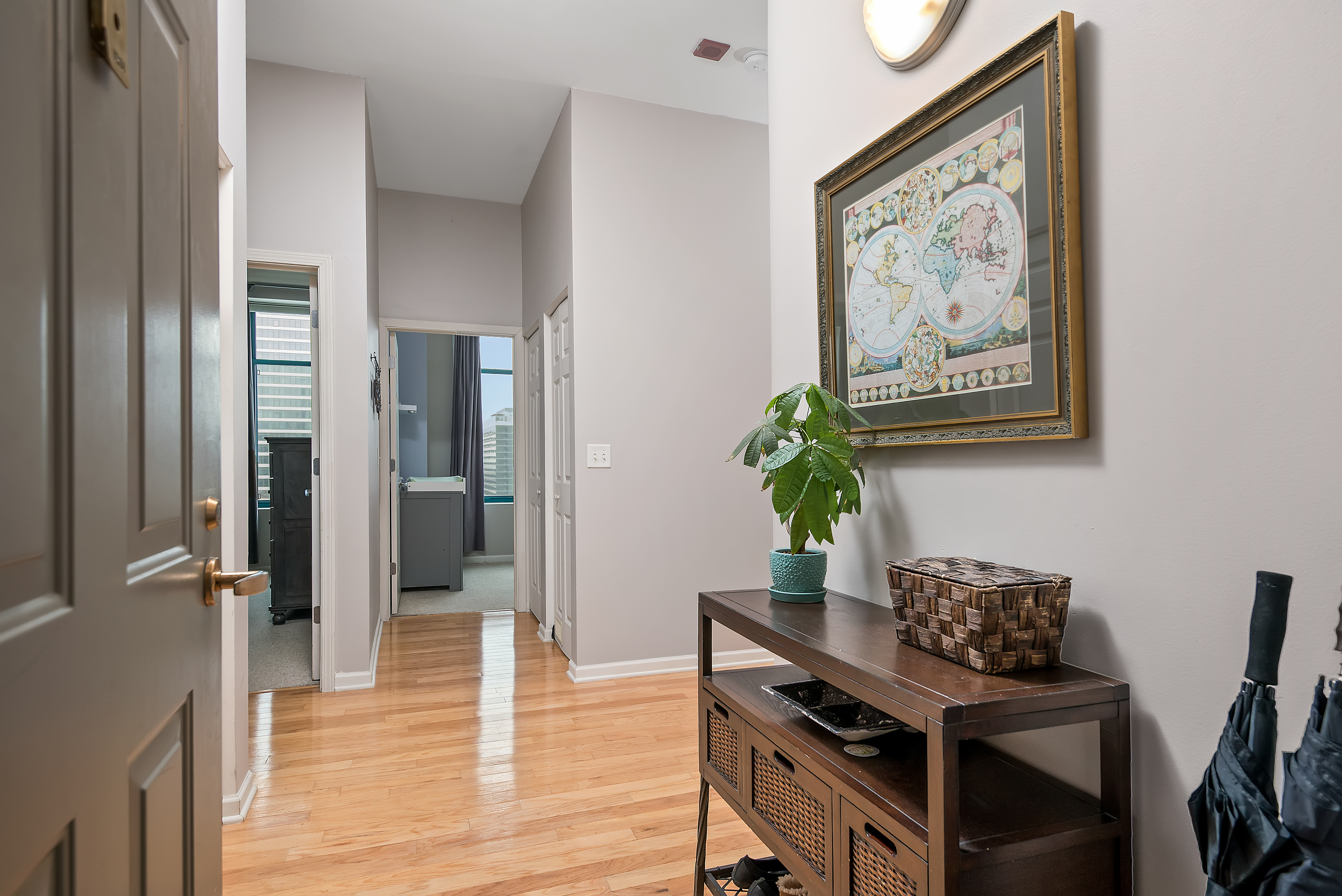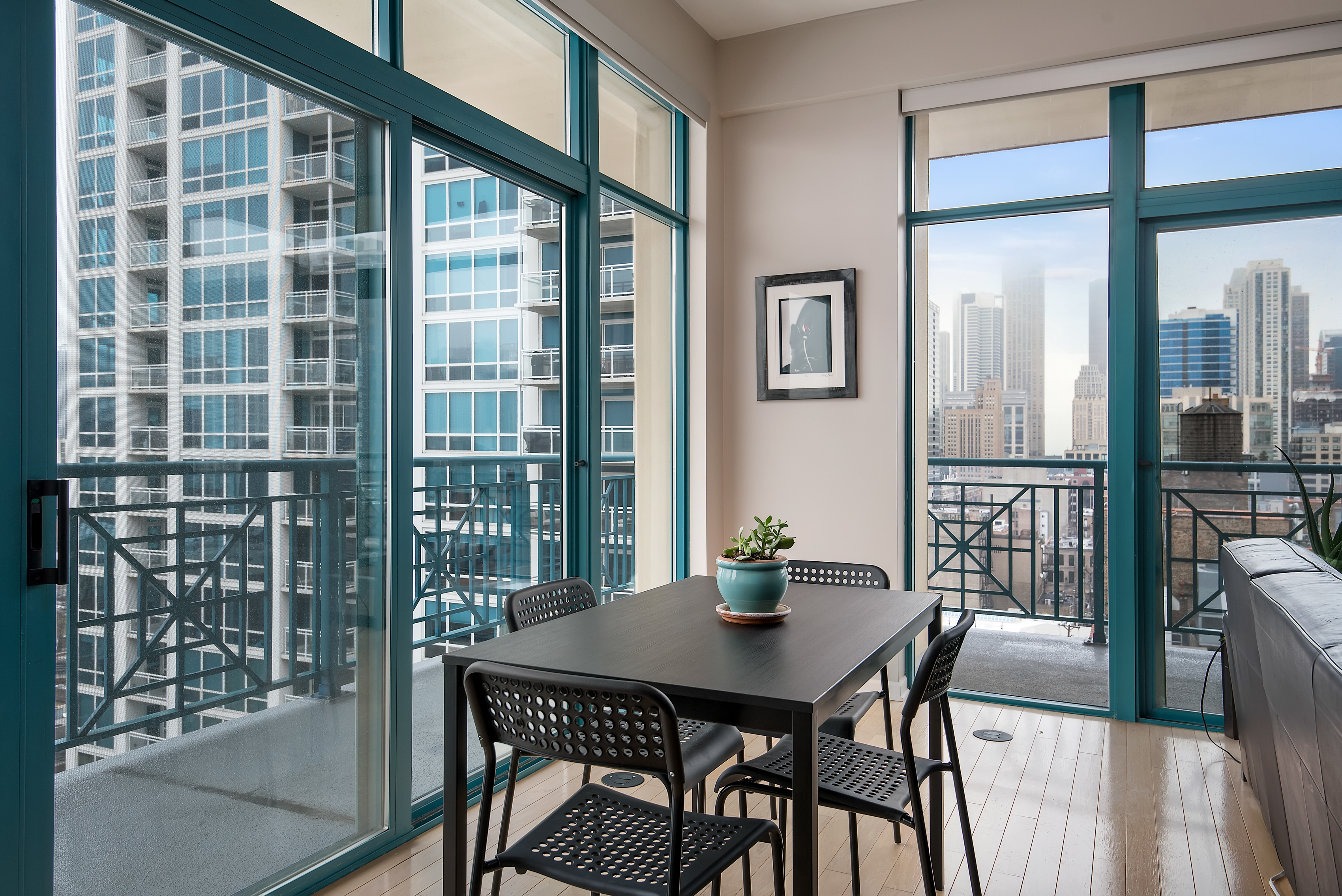 Gorgeous views of downtown from every room in this 2 bed/2 bath corner condo in River North w/10 ft ceilings, Eastern & Northern exposures and a huge wrap around balcony. The spacious open floor plan is perfect for entertaining, easily fitting a dining room table for 8 with plenty of room for a large living room. The huge kitchen has SS appliances, granite counters and tons of cabinet/counter space. The condo is flooded w/ light from the floor to ceiling windows, but also has automatic blinds for privacy. Large master bedroom easily fits a king bed. In-unit laundry. Crown molding in both bedrooms. Coat and linen closets. Premium garage parking spot near the elevator is an additional $35K. 24 hour door staff, top floor fitness room w/ skyline views, sundeck, storage cage in basement, market and drycleaner on site. Walk to everything including the El (one block away), a park & playground, dog park, the Lake, amazing shops and restaurants, Michigan Ave & more.